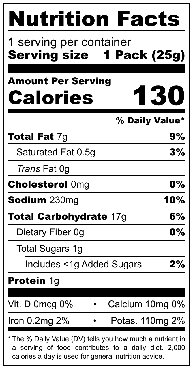Potato Starch, Potato Flour, Vegetable Oils in Varying Proportions (Sunflower, Rapeseed), Pea Starch, Cornstarch, Salt, Sugar, Maltodextrin, Tomato Powder, Sweet Whey Powder, Onion Powder, Spices, Garlic Powder, Natural Flavors, Sodium Acetate, Citric Acid.