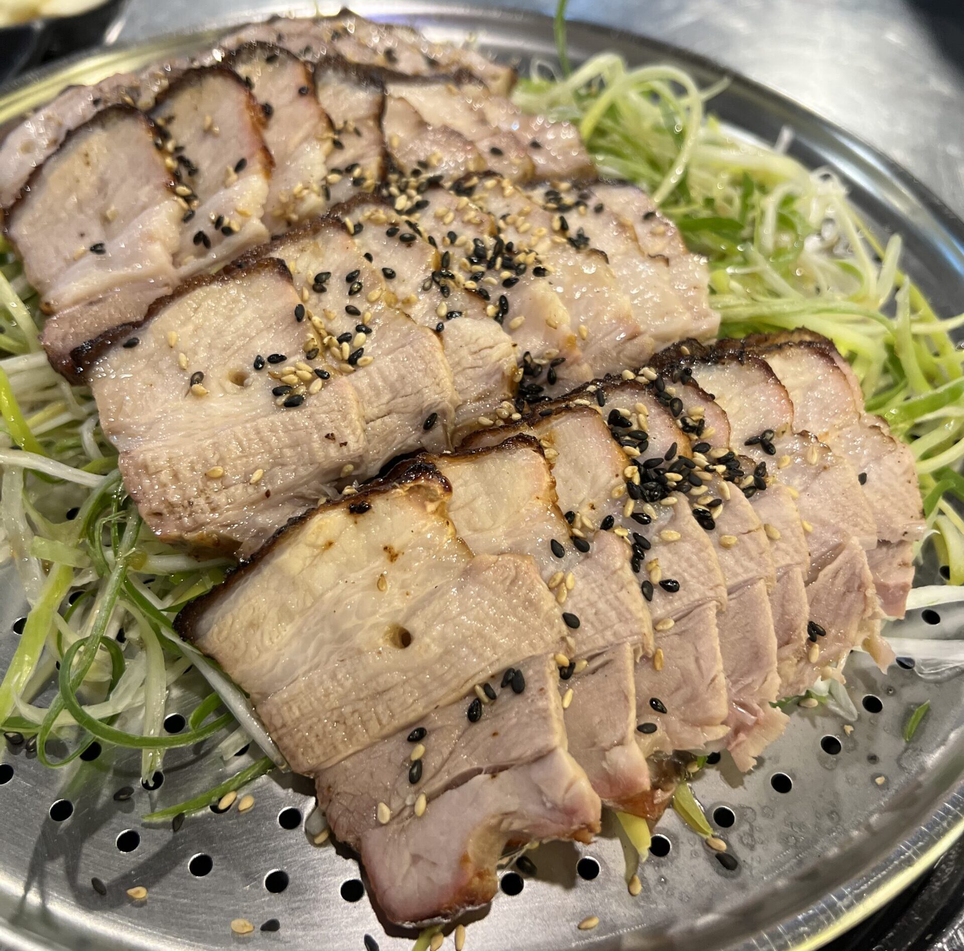 Deliciously tender and moist pork belly served with crunchy cabbage leaves and spicy radish salad!