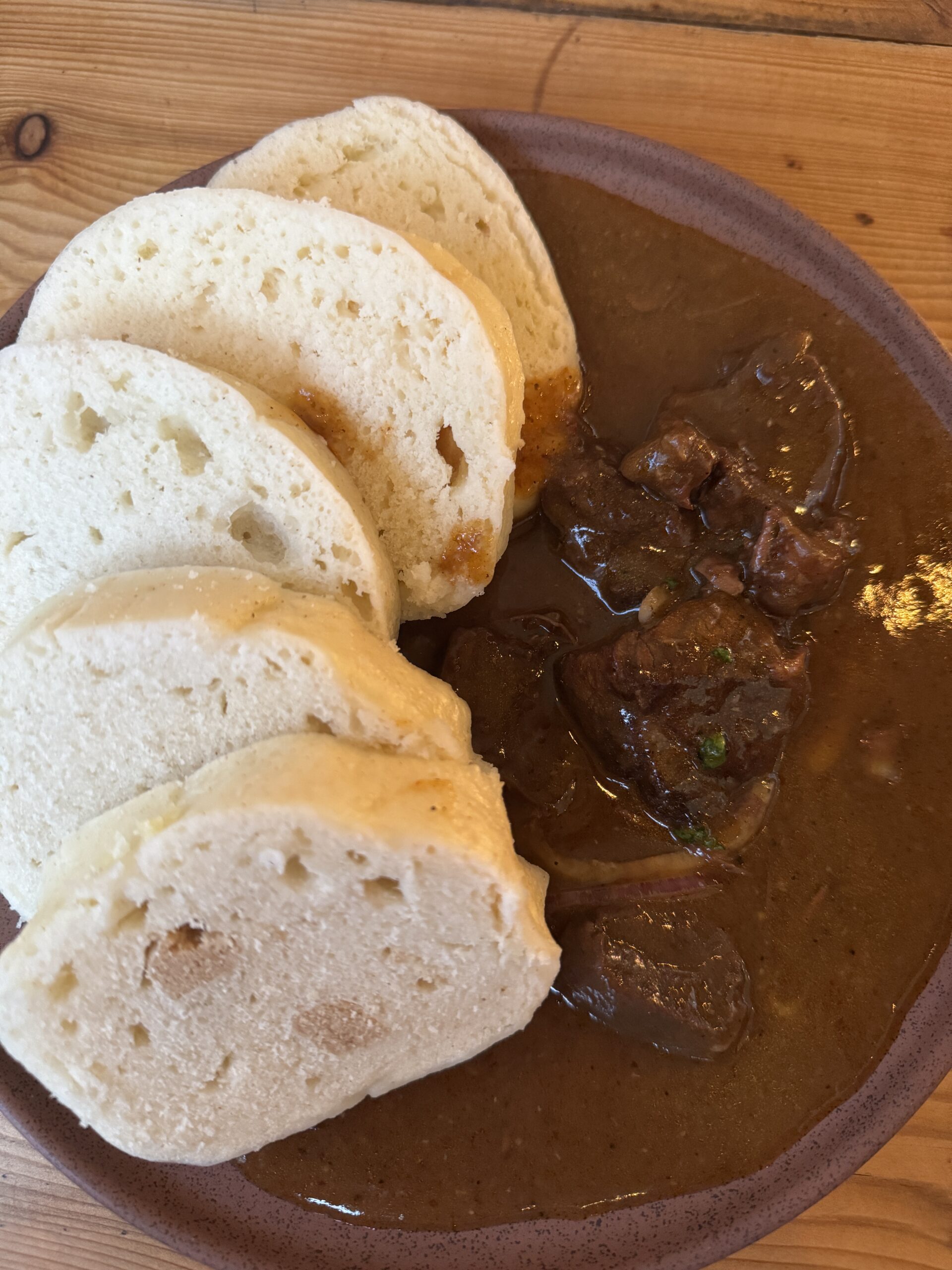 This beef-based dish is based on Hungarian goulash. It is a thick stew with beef, onions, spices, and bread dumplings.
