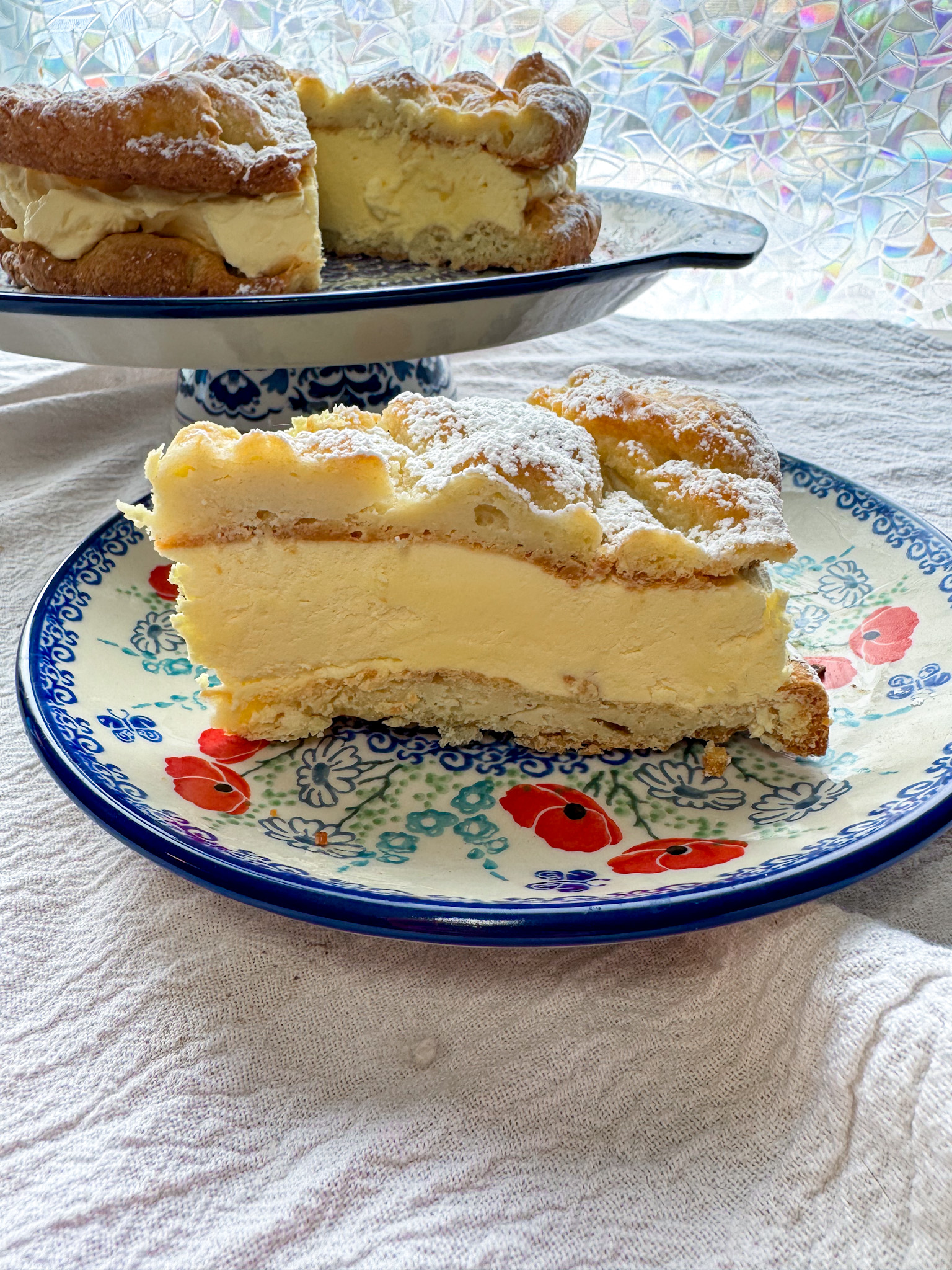 Karpatka is a classic Polish dessert made with two layers of choux pastry and a rich vanilla cream filling. It’s meant to look rustic and uneven to resemble the Carpathian Mountains.