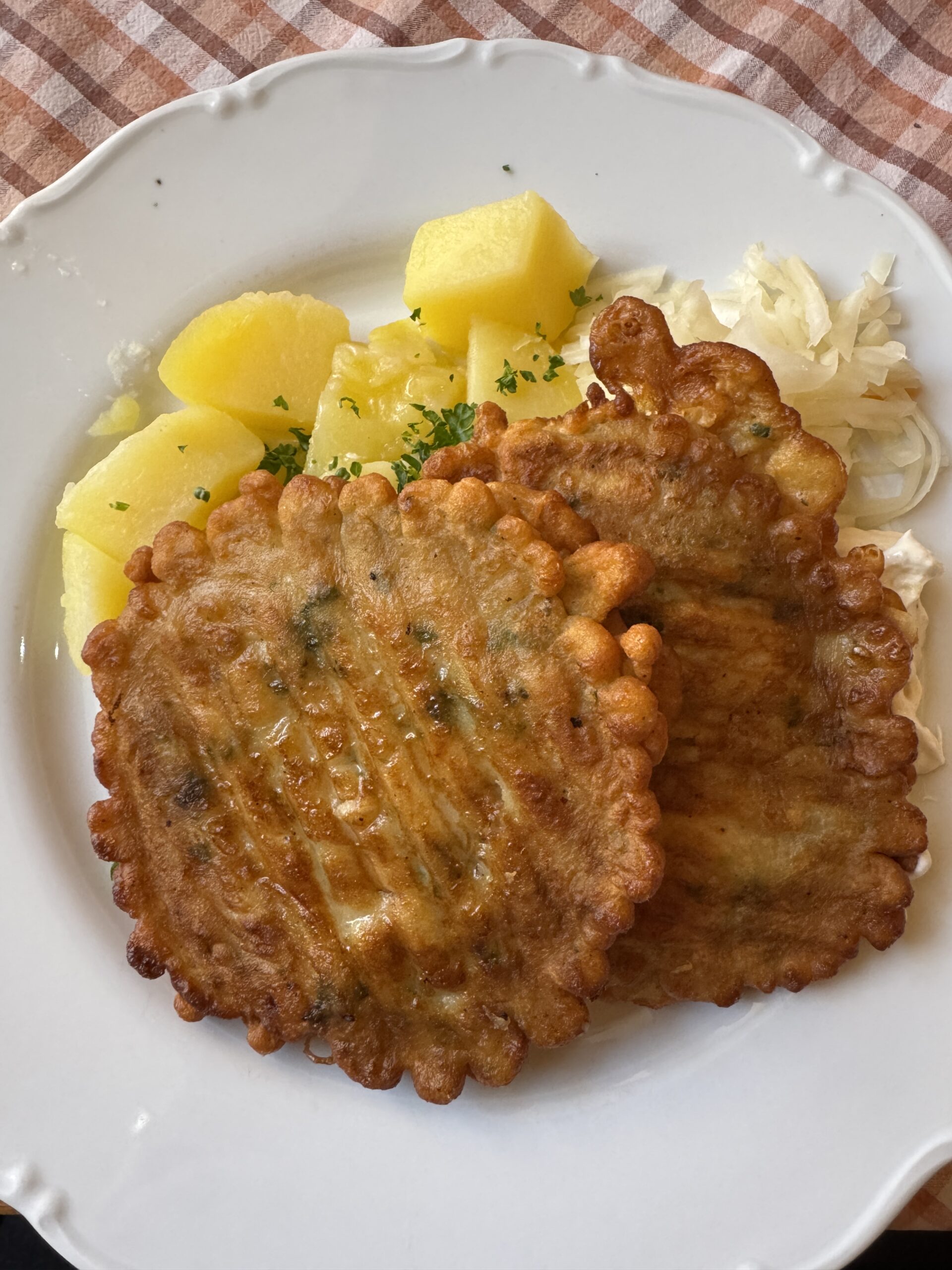 This meal is chicken medallions in garlic batter, with boiled potatoes, white pickled cabbage, and tartar sauce. Czechs love putting meat in batter, and anything garlic is a yes!